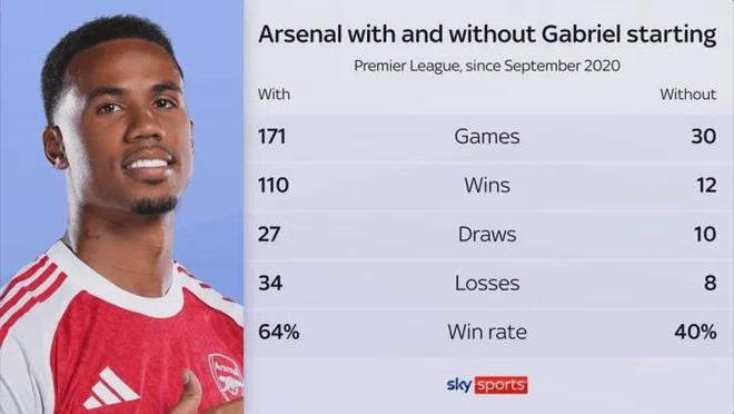 在俱乐部层面,加布里埃尔与萨利巴组成的阿森纳防线是世界一流的中卫搭档。本赛季,加布里埃尔在英超、欧冠等重要比赛中全部保持全勤。据天空体育统计,阿森纳在没有加布里埃尔的情况下,胜率下跌多达24%。自2020年9月以来,加布为阿森纳出战的171场比赛中,阿森纳取胜110场,胜率64%;而加布缺阵的30场比赛中,阿森纳12胜10平8负,胜率跌到40%,差距明显。